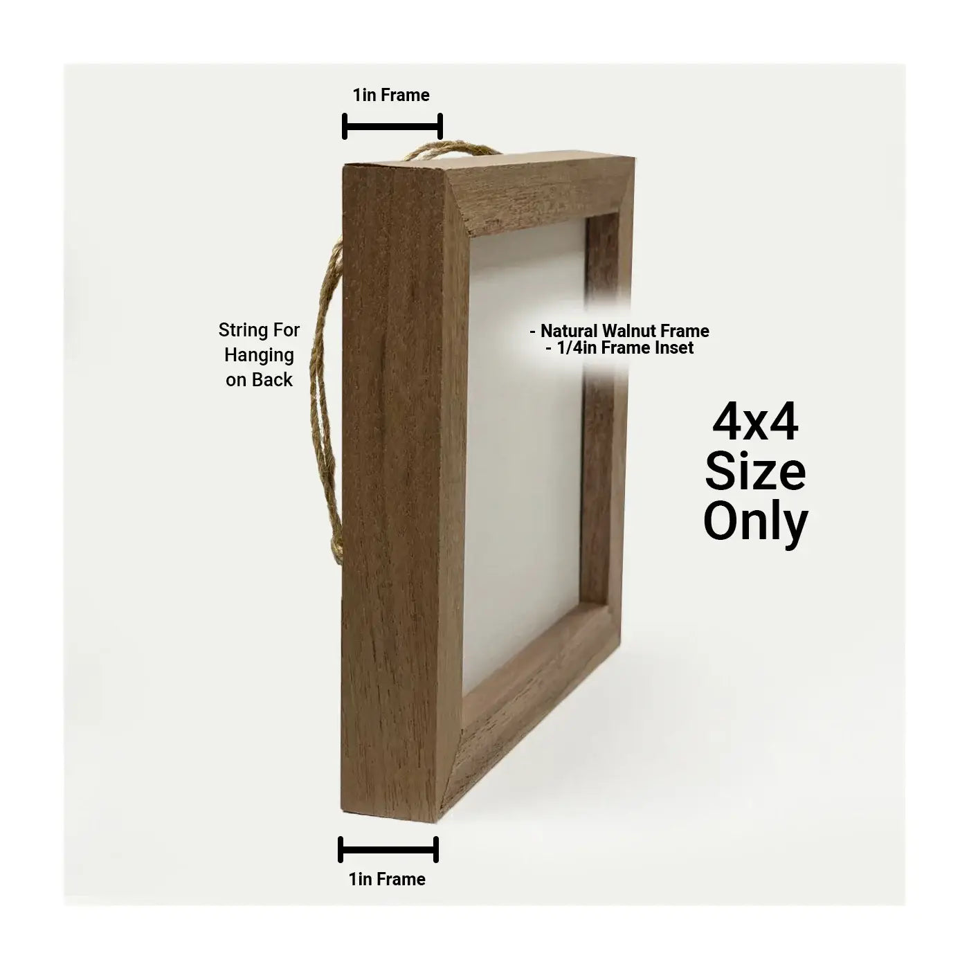 This unique piece is a simple way to bring beauty and charm to any wall or shelf within the home. It is made from high quality American hardwood planks with a hand painted face, and printed with UV cured ink, and is framed in a natural walnut frame. Each piece is unique with its own personality, marks, wood grain, and look. Easy to clean with a dry cloth.